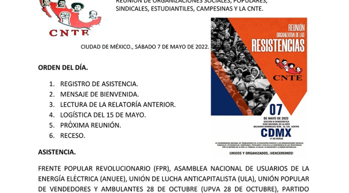 ACUERDOS DE LA REUNIÓN DE LAS RESISTENCIAS: ORGANIZACIONES SOCIALES, POPULARES, SINDICALES, ESTUDIANTILES, CAMPESINAS Y LA CNTE