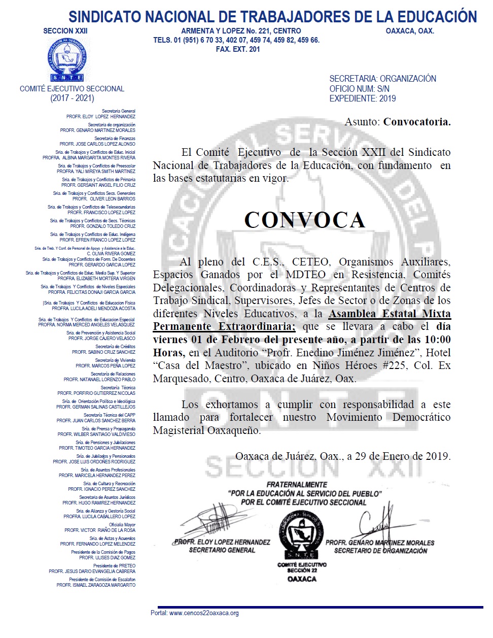 La Sección XXII de la Coordinadora Nacional de los Trabajadores de la Educación convoca a las representaciones sindicales y oficiales a la Asamblea Estatal Mixta Permanente Extraordinaria que se llevará a cabo el día viernes 01 de febrero de 2019, a partir de las 10:00 horas en el auditorio “Enedino Jiménez Jiménez”, Oaxaca de Juárez, Oaxaca.