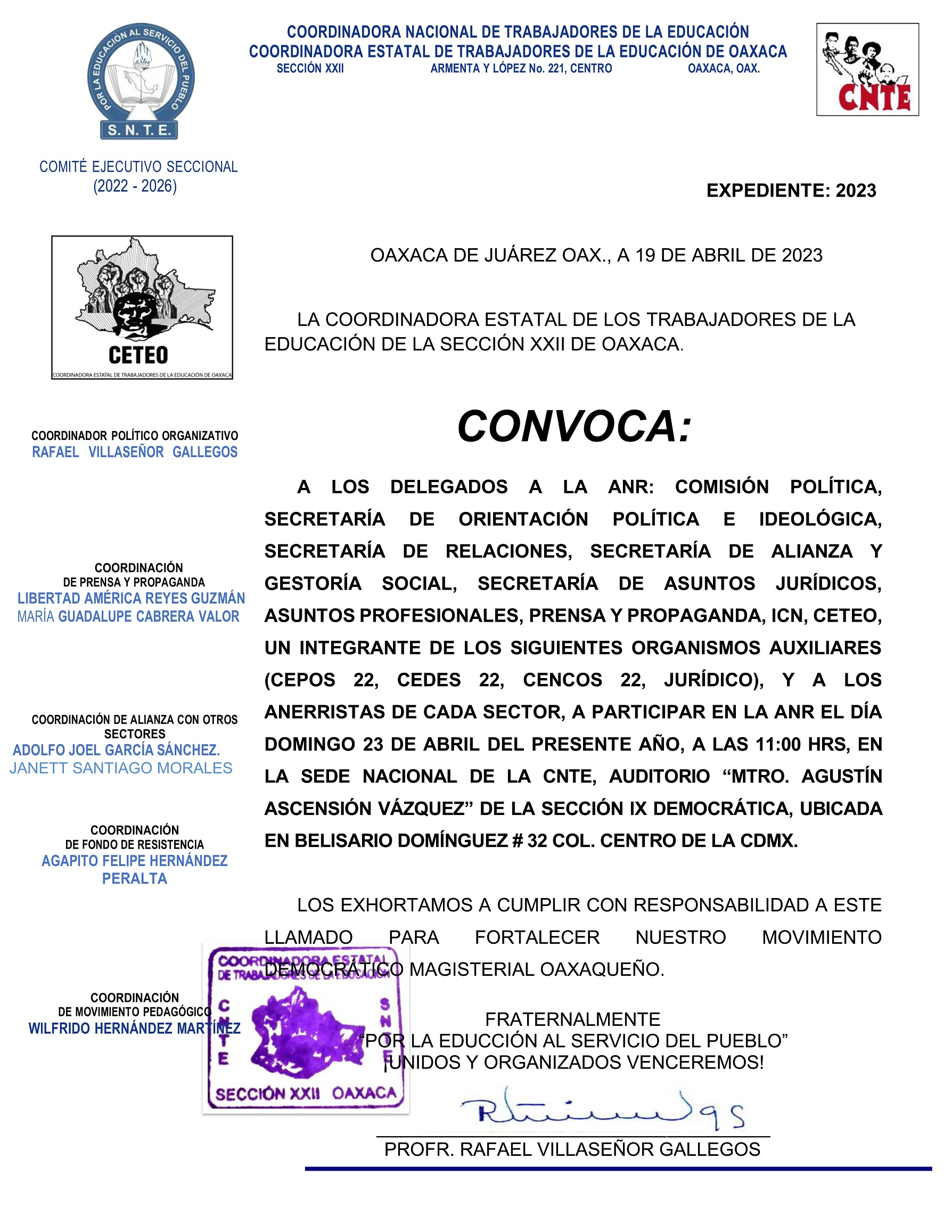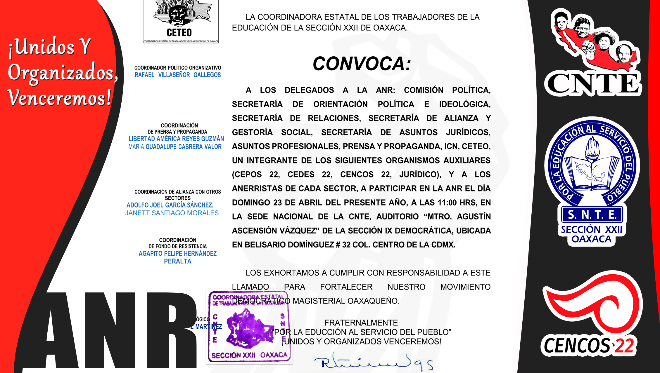 La Coordinadora Estatal de Trabajadores de la Educación de Oaxaca convoca a los delegados a la ANR: Comisión Política, Secretaría de Orientación Política e Ideológica, Secretaría de Relaciones, Secretaría de Alianza y Gestoría Social, Secretaría de Asuntos Jurídicos, Asuntos Profesionales, Prensa y Propaganda, ICN, CETEO, un integrante de los Organismos Auxiliares CEPOS 22, CEDES 22, CENCOS 22, Jurídico y a los Anerristas de cada Sector, a participar en la ANR que se llevará a cabo el día domingo 23 de abril del presente año, a las 11:00 horas, en la Sede Nacional de la CNTE, auditorio “Mtro. Agustín Ascensión Vázquez” de la Sección IX Democrática, ubicada en Belisario Domínguez #32 Col. Centro de la CDMX.