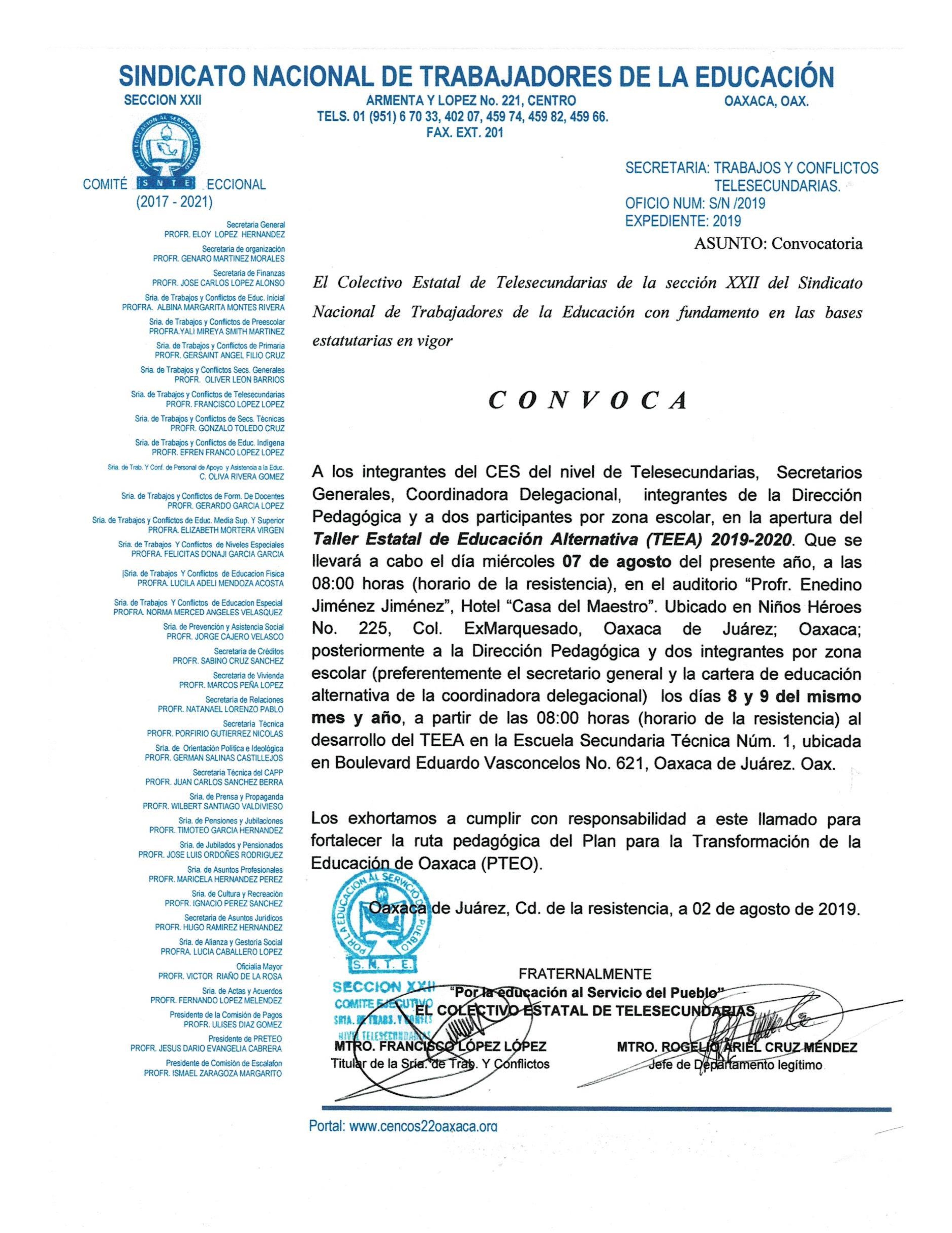 Difundimos la convocatoria del Nivel de Telesecundarias de la Sección XXII de la Coordinadora Nacional de los Trabajadores de la Educación (CNTE) para asistir al Taller Estatal de Educación Alternativa 2019-2020 que se desarrollará los días 7, 8 y 9 de agosto.