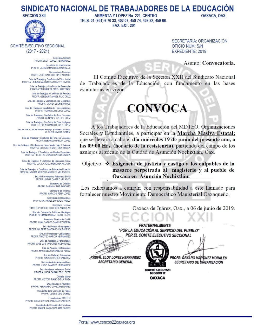 Convocatoria para la Marcha Masiva Estatal que se llevará a cabo el día miércoles 19 de junio a partir de las 9:00 hrs en Asunción Nochixtlán por JUSTICIA Y CASTIGO a los culpables de la masacre de lesa humanidad.
