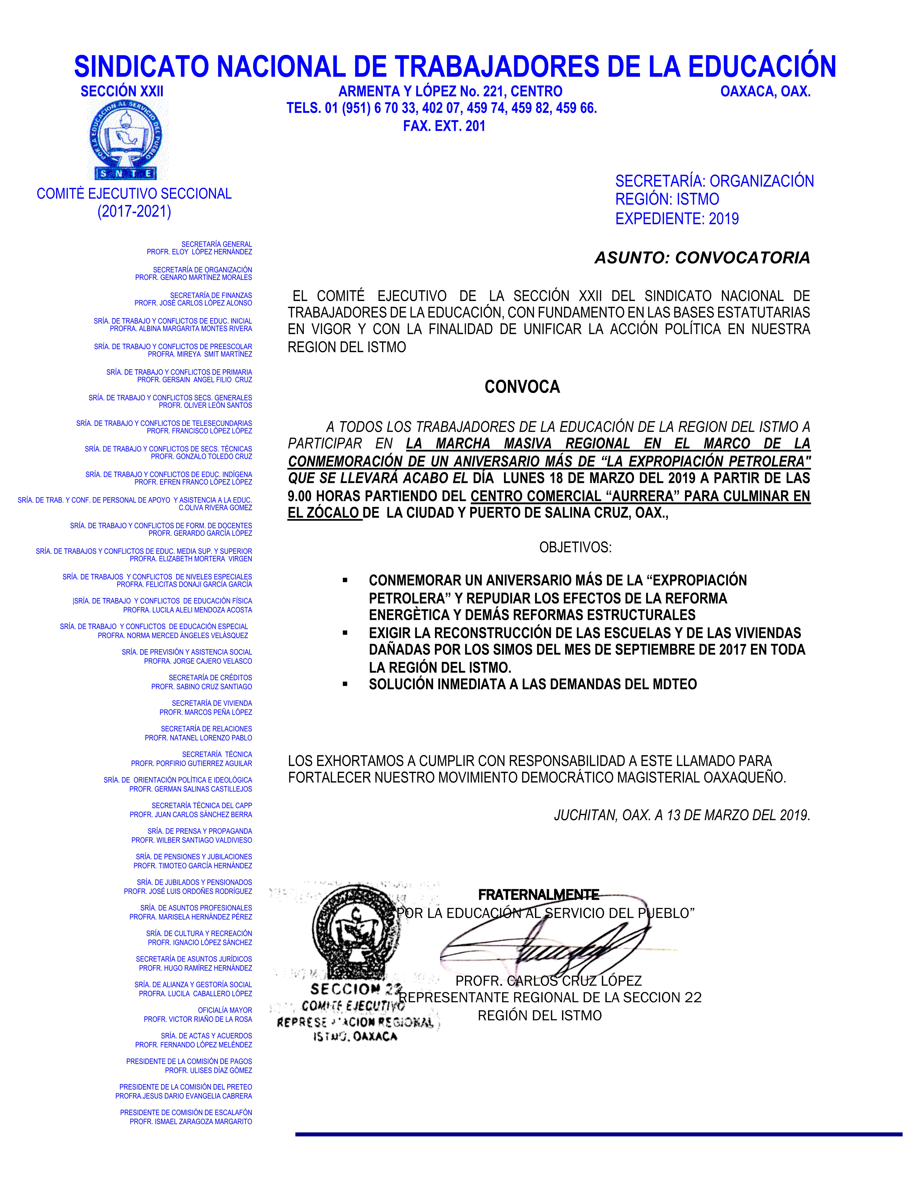 La Sección XXII de la Coordinadora Nacional de los Trabajadores de la Educación (CNTE) convoca a todos los compañeros de lucha de la región del Istmo a participar en la marcha masiva regional en el marco de la conmemoración de “La Expropiación Petrolera” que se llevará a cabo el día lunes 18 de marzo del 2019, a partir de las 9:00 horas partiendo de la carretera transístmica kilómetro 3, Col. Aviación, a la altura de conocido centro comercial para culminar en el zócalo del puerto de Salina Cruz, Oaxaca.