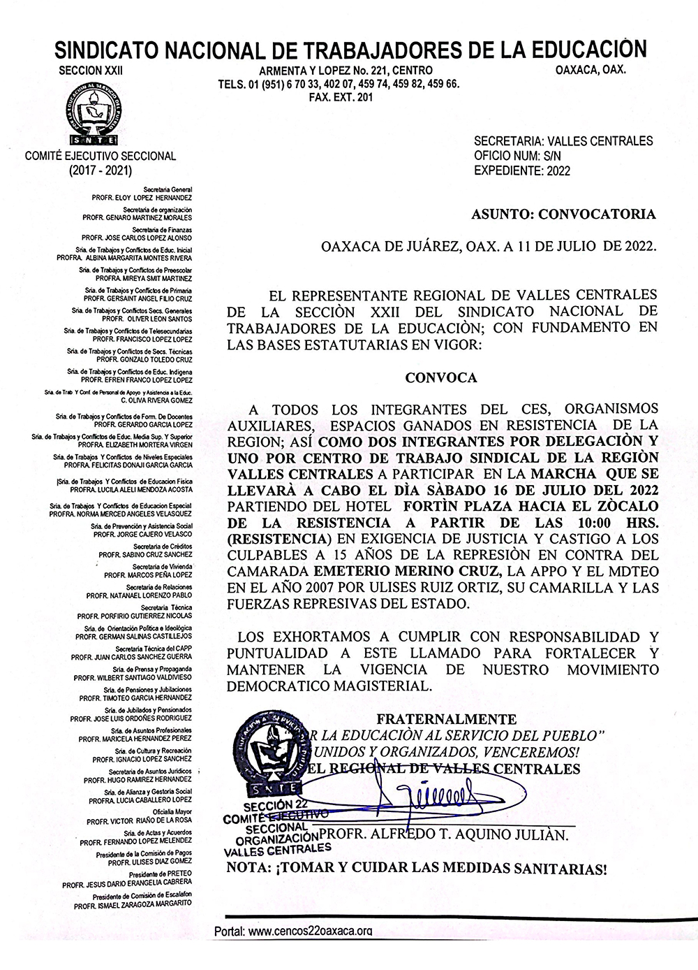 La Representación Sindical de la Región de los Valles Centrales convoca a todos los integrantes del CES, Organismos Auxiliares, Espacios Ganados en Resistencia de la Región; así como dos integrantes por delegación y uno por centro de trabajo sindical de la región a participar en la marcha que se llevará a cabo el día sábado 16 de julio del 2022 partiendo del Hotel Fortín Plaza hacia el zócalo de la Ciudad de la Resistencia, a partir de las 10:00 hrs. (resistencia), en exigencia de justicia y castigo a los culpables a 15 años de la represión en contra del camarada Emeterio Marino Cruz, de la APPO y del MDTEO por Ulises Ruiz Ortiz, su camarilla y las Fuerzas represivas del Estado.